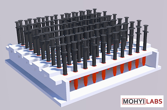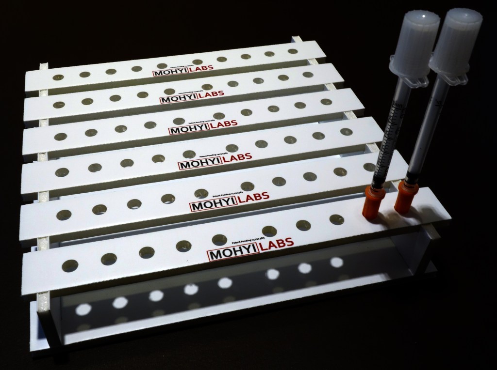 These syringe holders were designed as a simple fix for quickly counting Botox and Dysport syringe inventory in a cosmetic clinic. Before, the syringes were stored in bags and had to be counted individually. With the syringe holders, the syringes could be counted in fives or tens. This increased inventory efficiency and decreased counting mistakes. This simple design is patent pending.